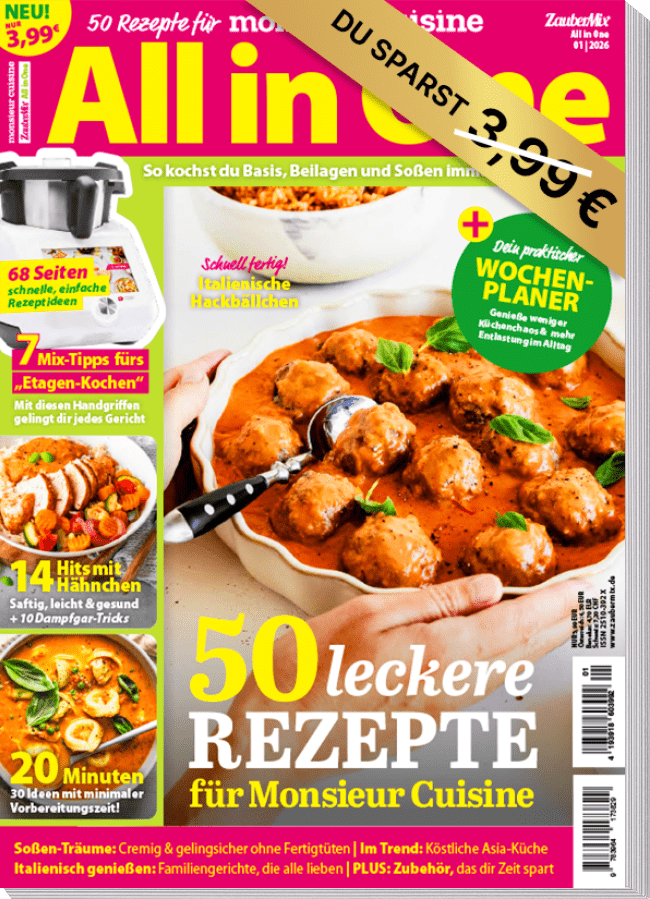 Mit nur einem Gerät zu mehr Geschmack, weniger Aufwand und maximaler Vielseitigkeit: Das neue Sonderheft All in One zeigt dir, wie du deinen Monsieur Cuisine clever und voll ausnutzt – für Alltag, Familie und Genussmomente zwischendurch. Ob cremige Soßen, Trendgerichte im Asia-Style oder komplette Mahlzeiten in nur 20 Minuten – hier findest du 50 schnelle Lieblingsrezepte, die alles in einem Topf erledigen. Ideal für alle, die Zeit sparen wollen, aber auf Geschmack und Vielfalt nicht verzichten möchten.
