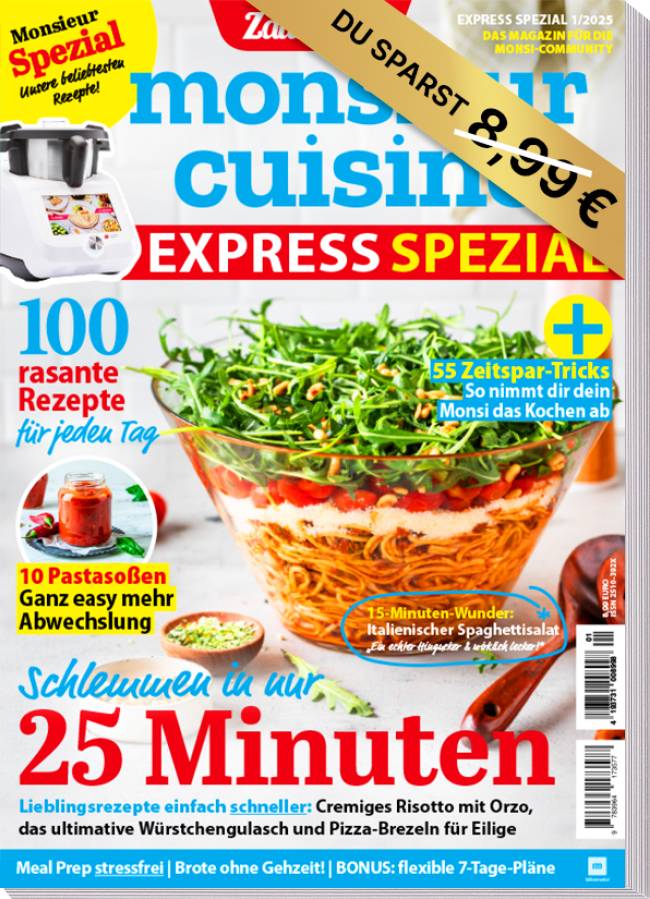 Schlemmen in nur 25 Minuten – In der Woche frisch kochen, obwohl die Zeit knapp ist – das muss kein Widerspruch sein! In dieser Sonderausgabe zeigen wir, wie du mit nur 25 Minuten Vorbereitungszeit köstliche Gerichte zauberst, während der Monsieur den Großteil der Arbeit übernimmt. Rezepte wie unser cremiges Risotto mit Orzo oder das beliebte Wurstgulasch gelingen garantiert. Bei uns im Team unter den Top-5: die Pizza-Brezeln, perfekt als Express-Snack oder für spontanen Besuch.