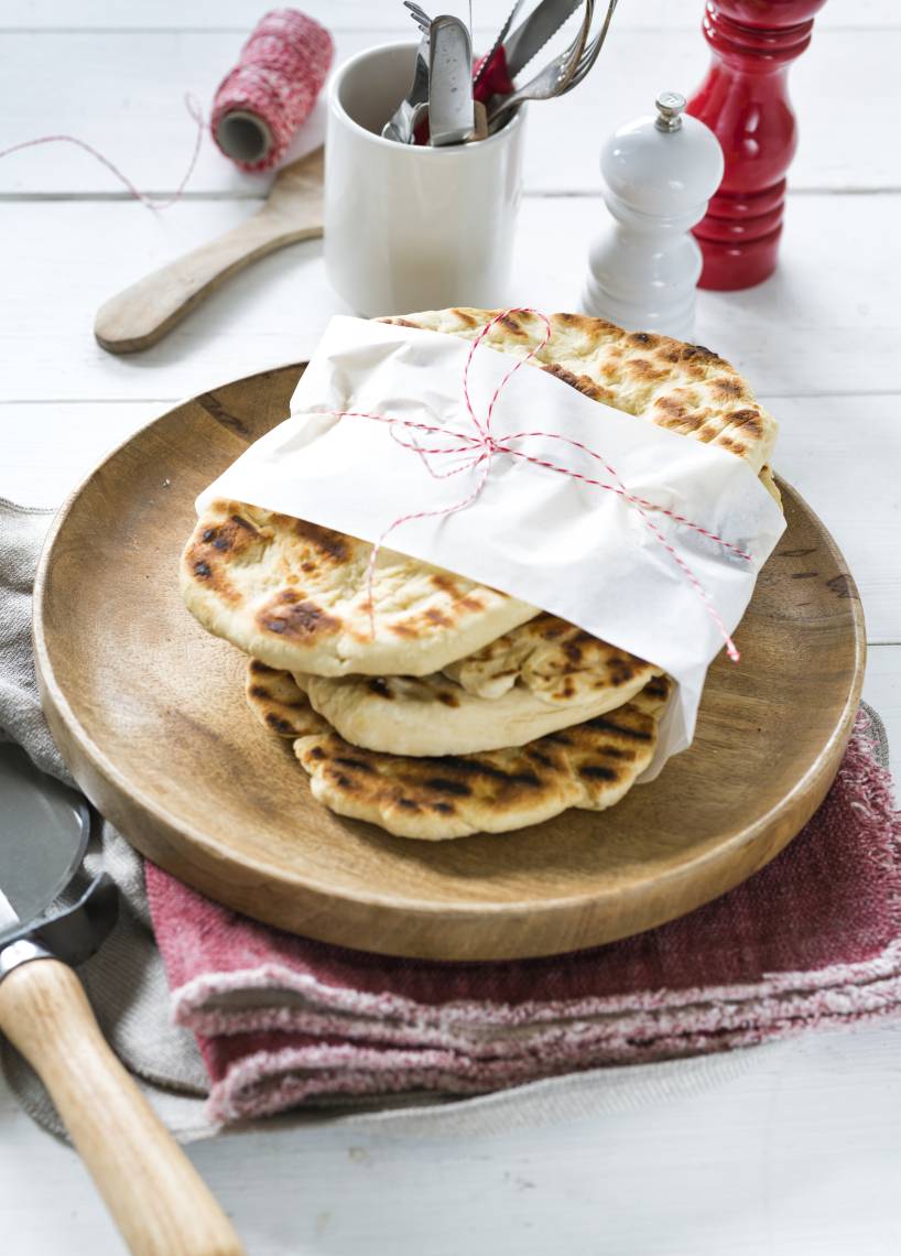 Zu 4 länglichen Fladen oder, wie auf unserem Titelbild, zu 8 kleineren, runden Fladen formen und auf dem Grill goldbraun backen.