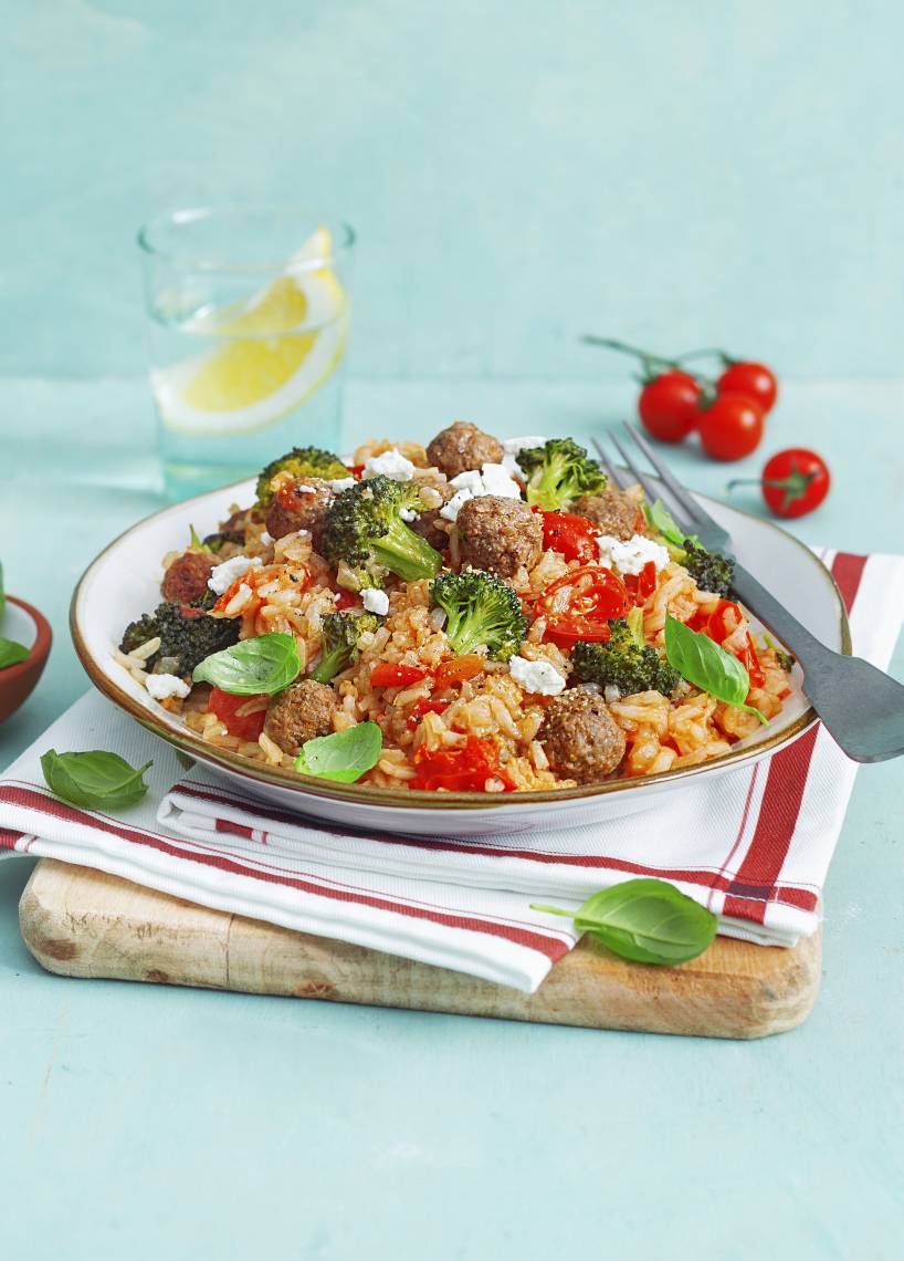 Dieses würzige All-in-one-Rezept für Reis mit Hackbällchen steht in 30 Minuten auf dem Tisch. Dank Brokkoli, Tomaten, Feta und feinen Gewürzen bekommt der Reis-one-Pot seinen frisch-würzigen Geschmack. Wenn du uns fragst: Dieses Gericht ist das perfekte Mittagessen für die ganze Familie.