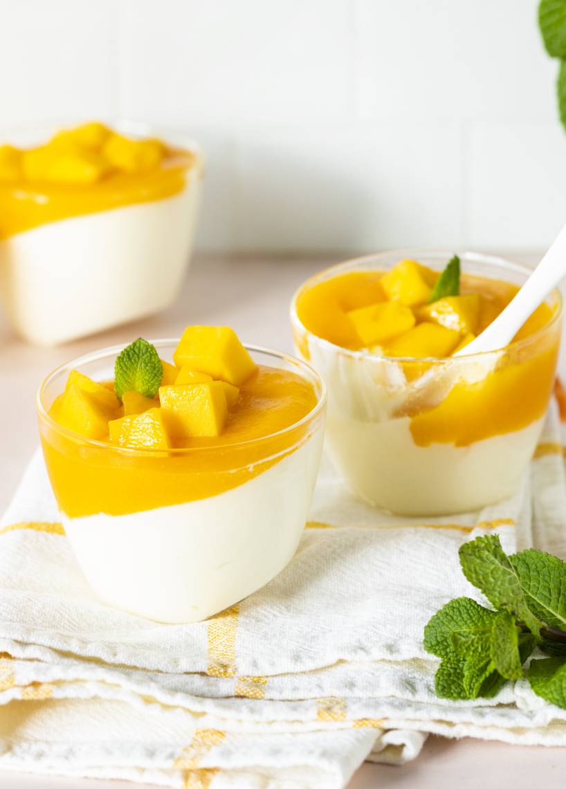 Joghurt zugeben und alles 10 Sek. | Stufe 3 vermengen. Den Rühraufsatz entnehmen. Joghurtcreme, Fruchtsoße und Mangowürfel in die Gläser schichten und ca. 30 Min. kalt stellen. Mit Minze garnieren und servieren.